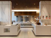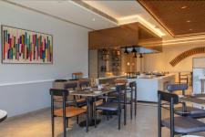 Inviting and stylish, the hotel rooms greet guests with contemporary wallpaper, unique lighting fixtures, and muted colours. The rooms are adorned with graphical illustrations of River Tapi and the bridges, serving as a reminder of how Surat's progress is attributed to the duo. Complementing the overall mood palette, the pendant lights cast a gentle glow that further accentuates the modern, sophisticated feel of each retreat. Exuding elegance and refinement, the banquet hall impresses with its plush carpeted floor, sleek marble walls, and ample natural light. At the heart of the hall, a remarkable linear cluster chandelier steals the show, capturing everyone's attention. An incredible example of modern design infused with regional influences, the all-day dining area features a striking fluted wood ceiling at its center and captivating artworks that celebrate Surat's thriving textile industry.
