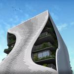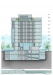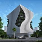 While the building is glazed along the office floor plate, a perforated screen envelopes the structure with cutouts at elegantly placed along the edges to open out in a small balcony on each floor. This modern take on the traditional jaali cuts out the sharp desert sunshine and filters light inside the office while regulating the ambient temperature of the inside spaces. These small balconies act as spill out areas with some fresh air breaks for the employees. These balcony cutouts open in the form of a drop and along the edge reflects itself to suggest rebirth because of recycling. A small self filtering water pond is planned to enhance the atmospheric moisture instantly reducing the temperature and lending a calm soothing visual.
