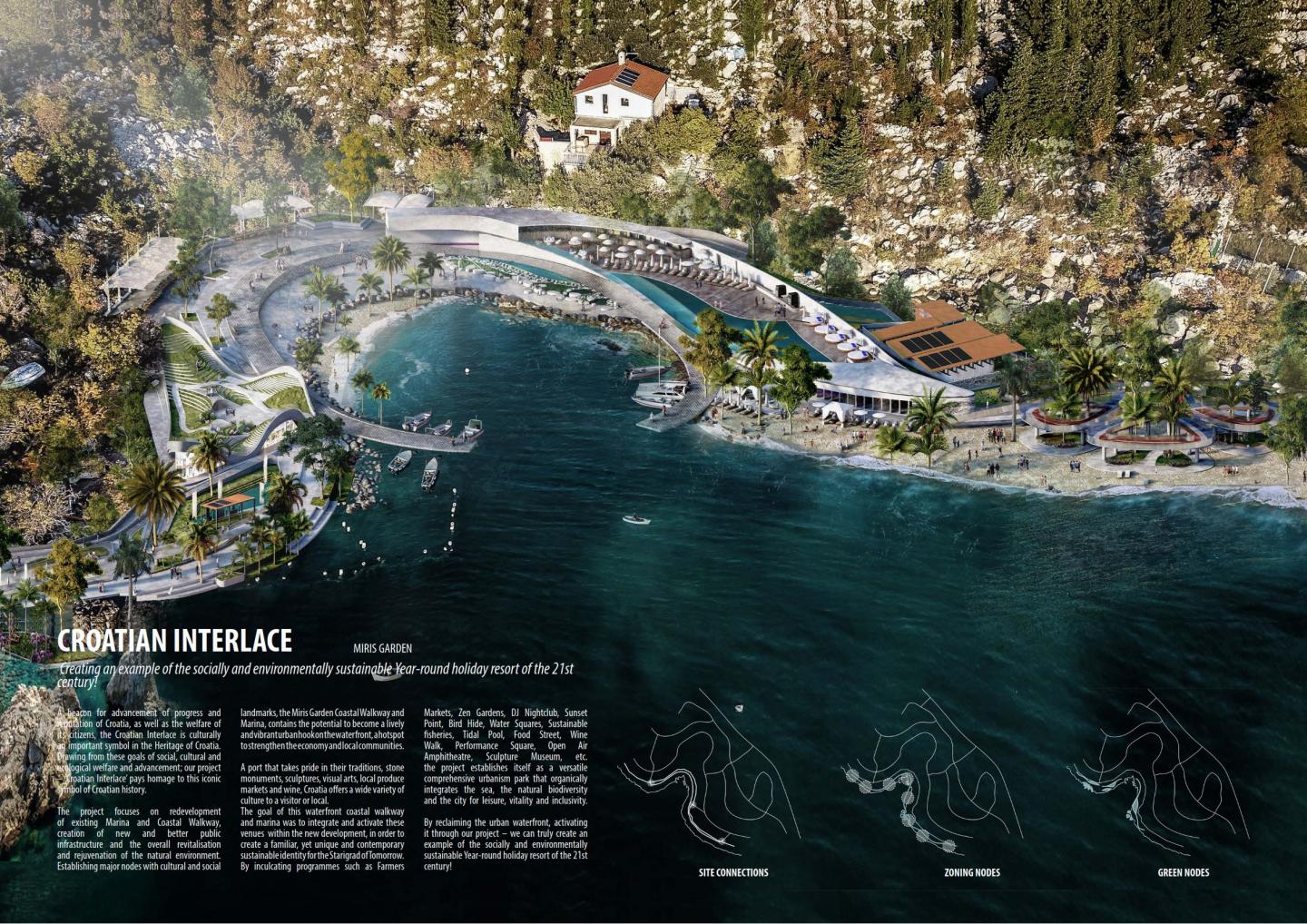 Other Built up such as the EV Station and cafes contain red roofs as is the cultural norm of Croatia. The entire site is landscaped to the fullest, with organic shapes derived from the natural meandering of the sea shore.