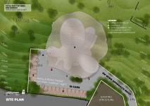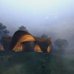 Undulating curvilinear volumes house a small museum & an open amphitheatre along the edge of a small hill in Buldhana, Maharashtra India.