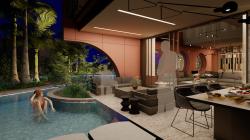 The pool, approximately 90 square meters in size, includes a landscape island and a fire-pit. It is designed to serve as a relaxation pool in front of the living room terrace. The firepit, accessible through stepping stones in the pool, enhances the pool experience and aims to blend into the generous landscape area surrounding it, which is integrated with the organic pool.