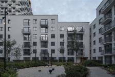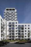 Located behind the blocks, the 25-story residential tower stands as a new navigational point in the quarter. Its exterior, location, and height complete the housing estate design, making it the final landmark of the dynamic waterfront. The stucco facade, matching the blocks, is complemented by a recessed porch with tall, brown, patterned fibre cement and PHL boards. A neat grid of evenly sized windows accented at the corners with spaced bedrooms and corner windows continues up the sixth floor. The facade narrows up at the two upper floors forming a podium. It features double-height apartments with a mezzanine floor.
