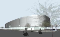 Vertically, the sandwich of “skins” allows for management of the sun through perforated screening suspended from the glass curtain wall, specifically on the east, west, and south elevations. The long north elevation of the building faces the street as a transparent surface of a lit glass box through which the interior of the building can be seen.