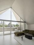 The top floor, designed as a multimedia, study and music room, offers street- and garden-facing partially covered terraces. On the side facing the garden, there is a floor-level "hammock" instead of a railing to the lower terrace. Here, the view sweeps over the trees and beyond the vineyards all the way to Vienna. A reminiscence of the old attic apartment of the Viennese days. From here, too, an external staircase leads to the lower terrace and from there directly to the garden.