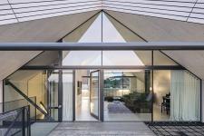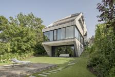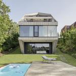 On the street side, the house is inspired by the neighboring houses with gable roofs typical of the area, but reinterprets the roof as a partially roofed outdoor space. There, the large single-family house appears discreet and blends in with the tectonics of the street fronts of the neighboring houses. Towards the garden, however, the house grows imposingly out of the slope and opens up to the landscape.
