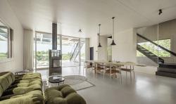 To escape the hectic rush of Vienna's city center, a family of four wishes for a domicile in the countryside that will also house a spacious artist's studio. One finds the perfect sloping site. The nature of the property formally invites the stacking of the different living environments. As a result, the 3-meter-high artist's studio is created in the lower level, partly nestled against the slope, partly on the same level as the garden. The covered terrace is also used as an outdoor studio.