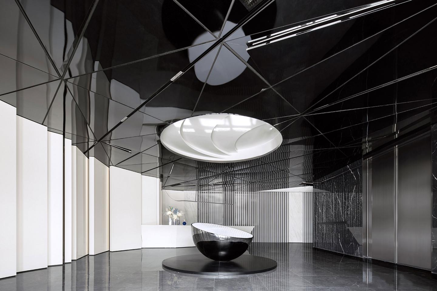 The ceiling, a massive projection screen crafted from black geometric mirrored stainless steel panels, emanates a pristine ambiance throughout the grand lobby area. Within the hemispherical installation "Imprint of Light," warm family scenes come to life against the backdrop of the cosmos. Pure forms, meticulously sequenced, undergo cutting, twisting, and dynamic interweaving, resembling mountains, rivers, and a city, symbolizing the evolution and nurturing of its inhabitants through the vicissitudes of time.