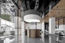 The grand and expressive future space gradually quiets down upon entering the negotiation area. Glass facades usher in the cityscape and copious natural light, while the architectural elements refine their scale, paying meticulous attention to details. Warmth is infused into the environment through the use of wooden materials. Lighting and structural elements meld seamlessly, creating a harmonious interplay of solidity and fluidity. It appears as though all the curved structures can unfurl at any moment, and people can pass through the luminous walls, stepping into the future.