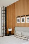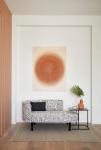 For instance, in the living room, we treated one of the walls with modern molding details, dividing it into distinct sections that were accentuated by artworks from the same series of one particular artist. These works gradually converged across the entire wall. The artist incorporated colors and resin embroidery beads derived from the threadwork of the vibrant green sofa positioned in front of it.
