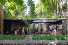 From within a piece of land beneath the main villa, emerged a metal room; it cannot be seen from above because its ceiling is leveled with the ground level and "building" is not quite fitting for this small room either. Expansion is more appropriate; the room has expanded from inside. Previously, it was used as storage chamber for fishing equipment because it's close to river. Now, the irons have given it shape. Project’s direction is from inside out. It looks out from inside an enclosed space, consisting of the thermal bath, a gathering area, facing the garden and river.