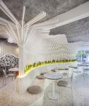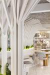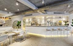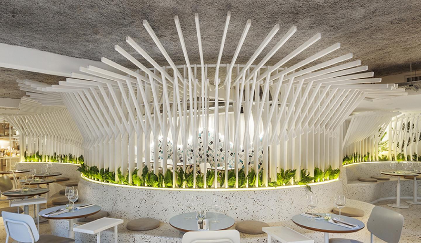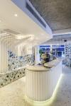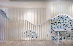 The project is inspired by the dreamlike universe of textures and materials from the Mediterranean world. The most characteristic element is the waves of the sea, which we implemented through two constructive elements on the ground and first floor. Both give a specific function, one of them as a bar back on the first floor, and the other as a long zigzagging bench that organizes the central area of the upper floor.