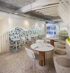 The terrazzo flooring in natural and ochre tones throughout the facility gives the space a sensibility of subtle and tiny stones that integrate with the "Mediterranean mood".