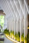 The use of white painted wood strips as cladding in most of the space generates a rhythmic texture which suggests a relationship with the strategy used in the areas developed with the waves.