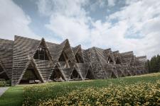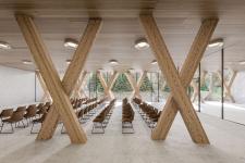 This is what informed the decision to connect the unconnectable: to make the facade become the roof. The facade is visually transformed into a timber gable roof, historically characteristic of the environment. The timber on the facade is freely stacked and unprotected, which will allow it to age and cohere with the surrounding landscape with its appearance. The new addition thus doesn't as much reference the existing building as it does the surrounding forest and the traditional rural development.