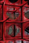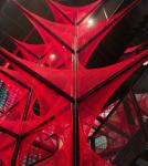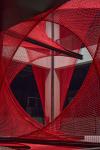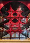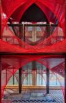 YI MU Design Office created a symbolic three-dimensional expansion of the single-sided pattern in the 14-meter-high space. The red brocade threads are attached and fixed to the frame, which is made of 20 steel bars. The diamond-shape structure inspired by the iconic pattern of the Tujia brocade is clearly visible from all angles.