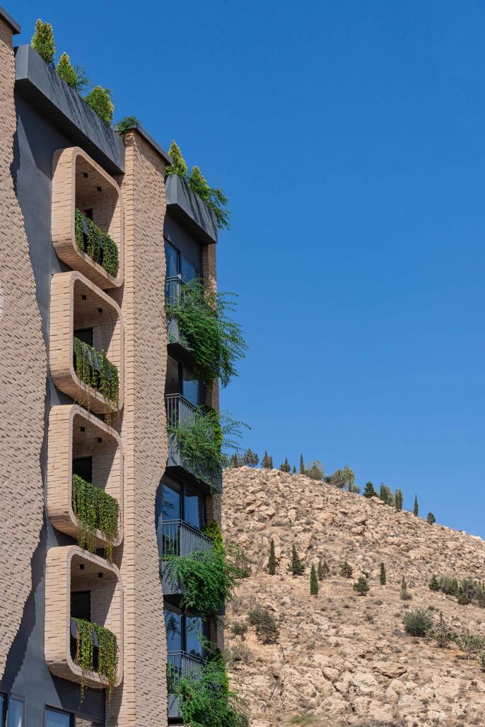 Koohsar Apartment is located in front of a mountain and in close proximity to its hillside. The building envelope conceals a portion of the mountain scene, and in order to visually assimilate the mountain scene behind the building and the building façade, the design team initiated an approach to blend in the proposed building. The brick material used for the building facade was chosen to complement the hue of the mountain in the distance. The brick pattern simulates a bottom-to-top movement and attracts the visitor’s attention to the background, and provides a seamless foreground.