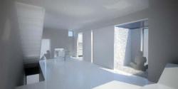 The concept of the individual is subverted in the interior of the houses. Each has the same arrangement of rooms, with small alterations on the length of the rooms themselves, always reflecting the size of the shell. They are presented in three different kinds of sizes, although maintaining the same cubic area. Each of the sizes also varies in three different ways. This is presented in both the size of the rooms and the layout and size of the windows. The ground floor, access level is a presentation room, accessible through a ramp, this is used as a showroom to each of the artist’s work. The ramp exists because the houses are one metre bellow, so they can use their terrace and maintain the 10-metre rule for the façade.