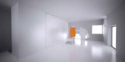 The second floor is a subtle arrangement of one volume that creates a room structure separated from the circulation and living room, by sliding panels. The rest of the second floor is an open space as well, that allows the artist to arrange his own personal objects.
