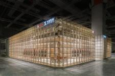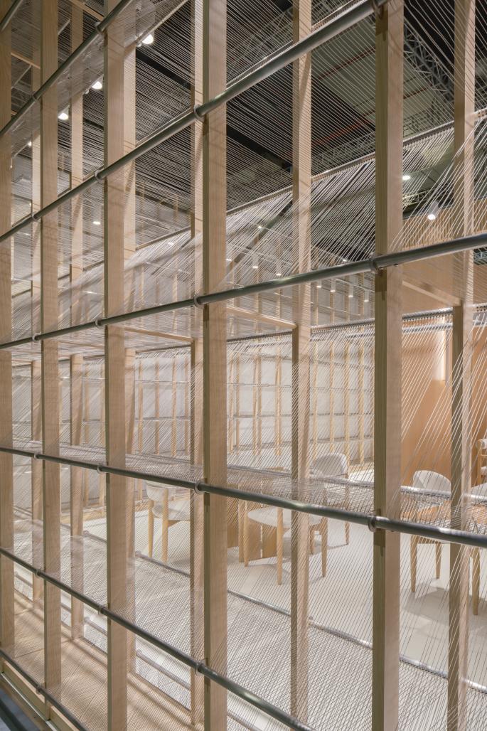 The intriguing pattern created with steel wires is inspired by traditional textile looms, which is not developed as merely a form or an object. The entire external wall is meant to act as a functional machine, where the hanging racks for product display and the lighting system are embedded and merged together to become an entirety, in order to avoid any separated elements and allow it becoming part of the experience, where the wired patterns framed and blurred the scenes inside as a sort of abstraction of image that may be seen through the lines.