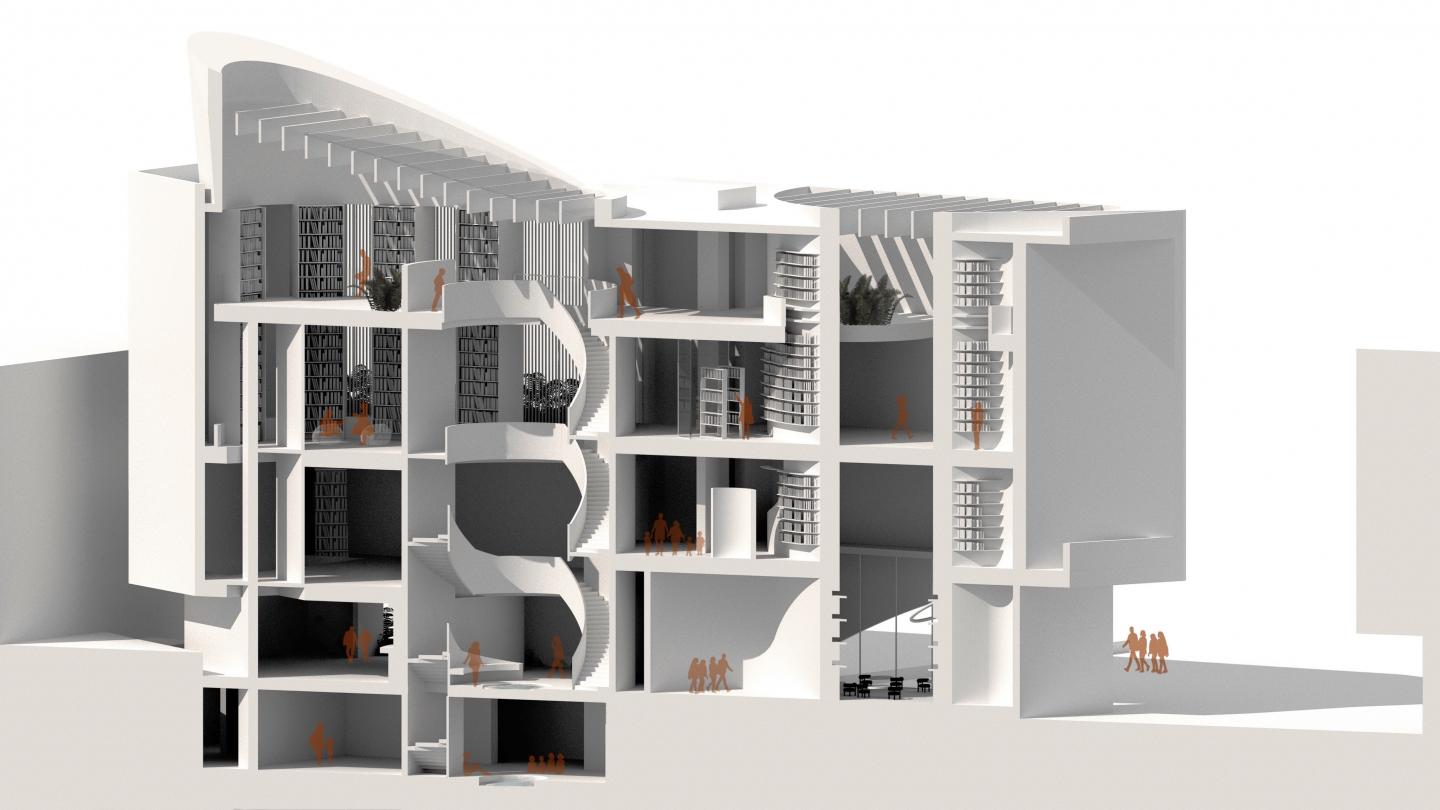 The round element is the main vertical circulation at the heart of the building, which consists of two main staircases in a double-helix configuration. Each staircase directs individuals to a specific route, where one is the formal library route, and the other is the social and family route. Therefore, the main double-helix staircase operates as a separator of functions in the building and ensures that the community experiences tranquil conditions and gathering conditions since the project should maintain a balance of both. A place that accommodates the beauty of focused education, and a place that invites unity to the community.