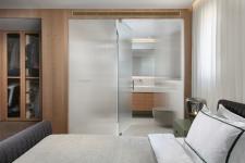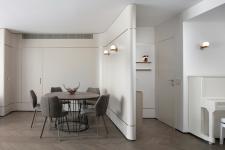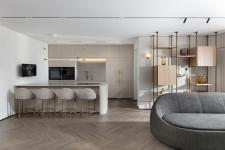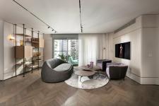 With an eye for detail, "The Jewelry Box" boasts expert carpentry, round edges, and brass accents, adding an understated touch of sophistication. Every piece of furniture was customized to harmonize with the apartment's curved aesthetics.
