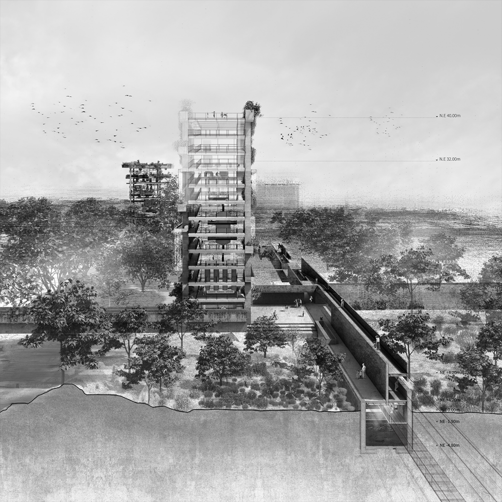 This project is composed of walls. Walls have historically been used to control, channel and divert bodies of water, under this logic we use a modern reinterpretation of what a wall is but not as an element of separation. In their interior they are capable of moving, capturing, filtering and gathering both the human and the non-human. The walls are joined with other elements that are transitory, they carry water and people, when the pieces come together, they compose a system which can have a scalable impact by replicating and connecting with the main ecological structure of the cities. Thus forming a livable public infrastructure. Each component of the system has the capacity to filter and store water. Once these uses are in place, human activity emerges, such as the pedagogical center, the use of water to generate food in the hydroponic gardens, and spaces for contemplation. As the wall rises, it takes on new properties and becomes a water catalyst since it makes water drinkable, generates water crops, is a viewpoint that generates a new relationship with the horizontal and verticalizes the landscape.