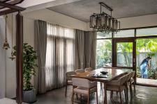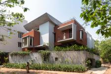 Within, the architectural palette embraces exposed concrete and brick, accentuating the robust forms. This material continuity extends into the interiors, manifesting as a brick datum wall traversing three levels, finally brushing against the boat-like curvature of the concrete roof that envelops and extends protectively over the entire structure. all the windows and doors are made from recycled wood salvaged from demolished old houses thereby making the house eco-friendly.