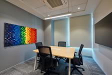 The project had the challenge of using colours however not making it look like a chaos. Hence meticulous choice of colours, their locations and surfaces went in the planning stage. Apart from furniture and wall colours, what also made a big difference was the artwork carefully chosen for the office. Every framed work was chosen to complement the theme of the organisation and only to enhance the look and feel. In this entire story, the carpet and the ceiling acted as the background artists. They were kept to the basic grey and white tones so that the vertical surfaces such as the walls, panelling etc gets the due importance and enhancement, which was needed to portray the right story.
