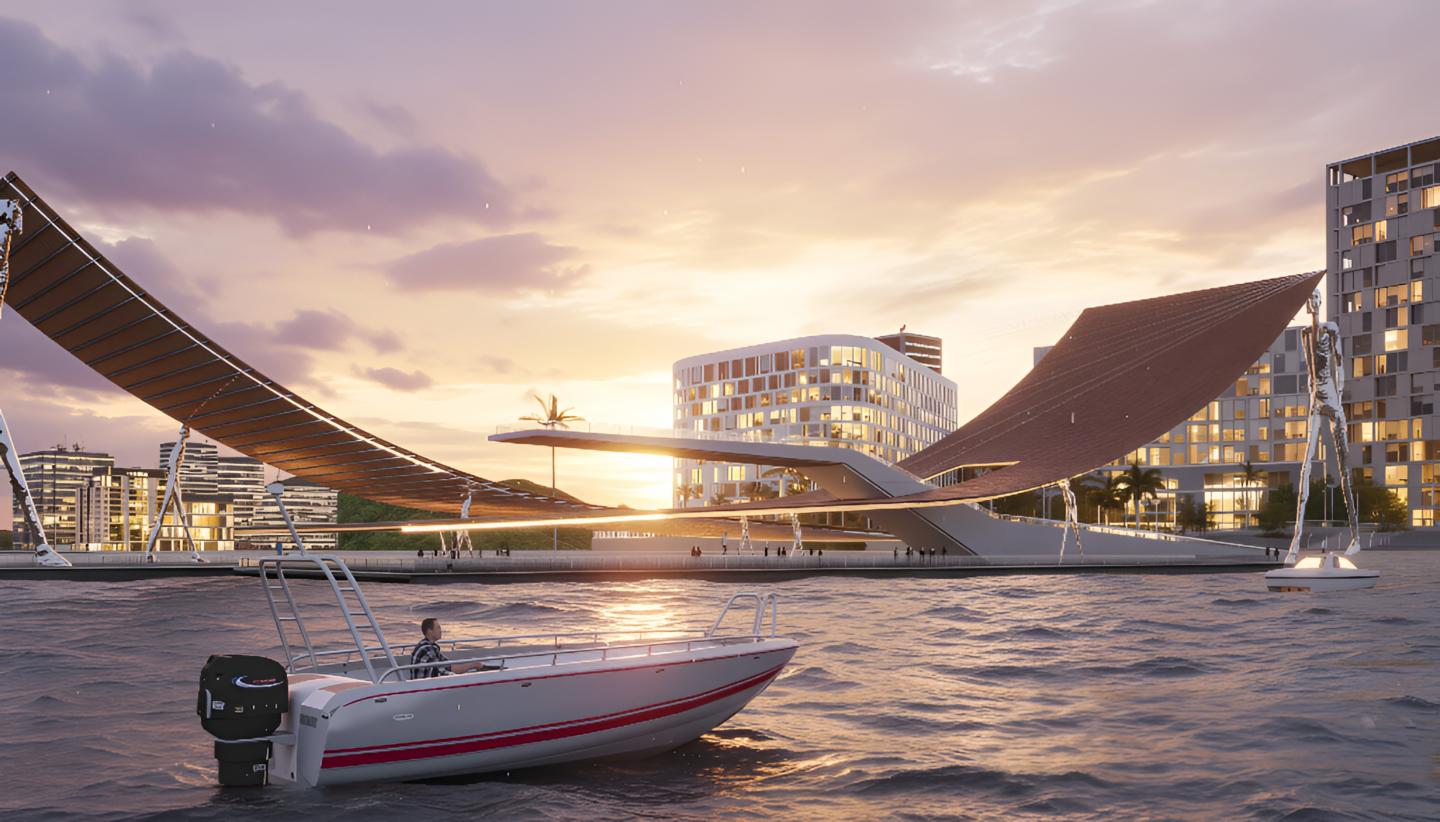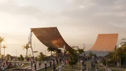 Their solid concrete bases with metal beams support a maritime channel on concrete pilotis, lifting the structure above sea level to create a sort of floodable port with an elevated lookout. Steel cables secure the wooden roof structure with a metal frame, transmitting forces through the sculptural figures, which simultaneously resist the strong coastal winds and support the roof. Its variable and non-continuous structure symbolizes that not every person carries the same burden—each one bears a different weight in life.