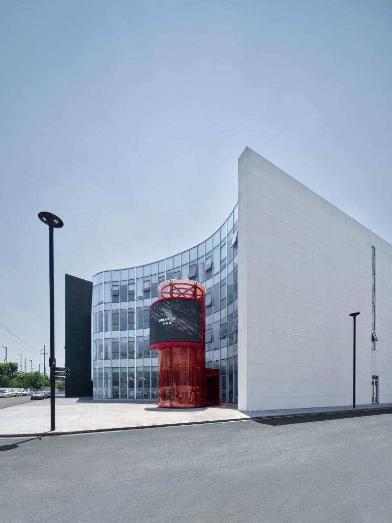 Located on the left side of the office lobby, the retail space has its main entrance on the north side of the building, serving as the primary entrance for consumers to do shopping and visit the showroom. It is adjacent to the city's main road and has a more outward-facing aspect compared to the office entrance. Through the outdoor cylindrical red transparent glass stairwell space, one can access both the ground floor and the second floor of the retail space as well as the showroom of the sightseeing factory.