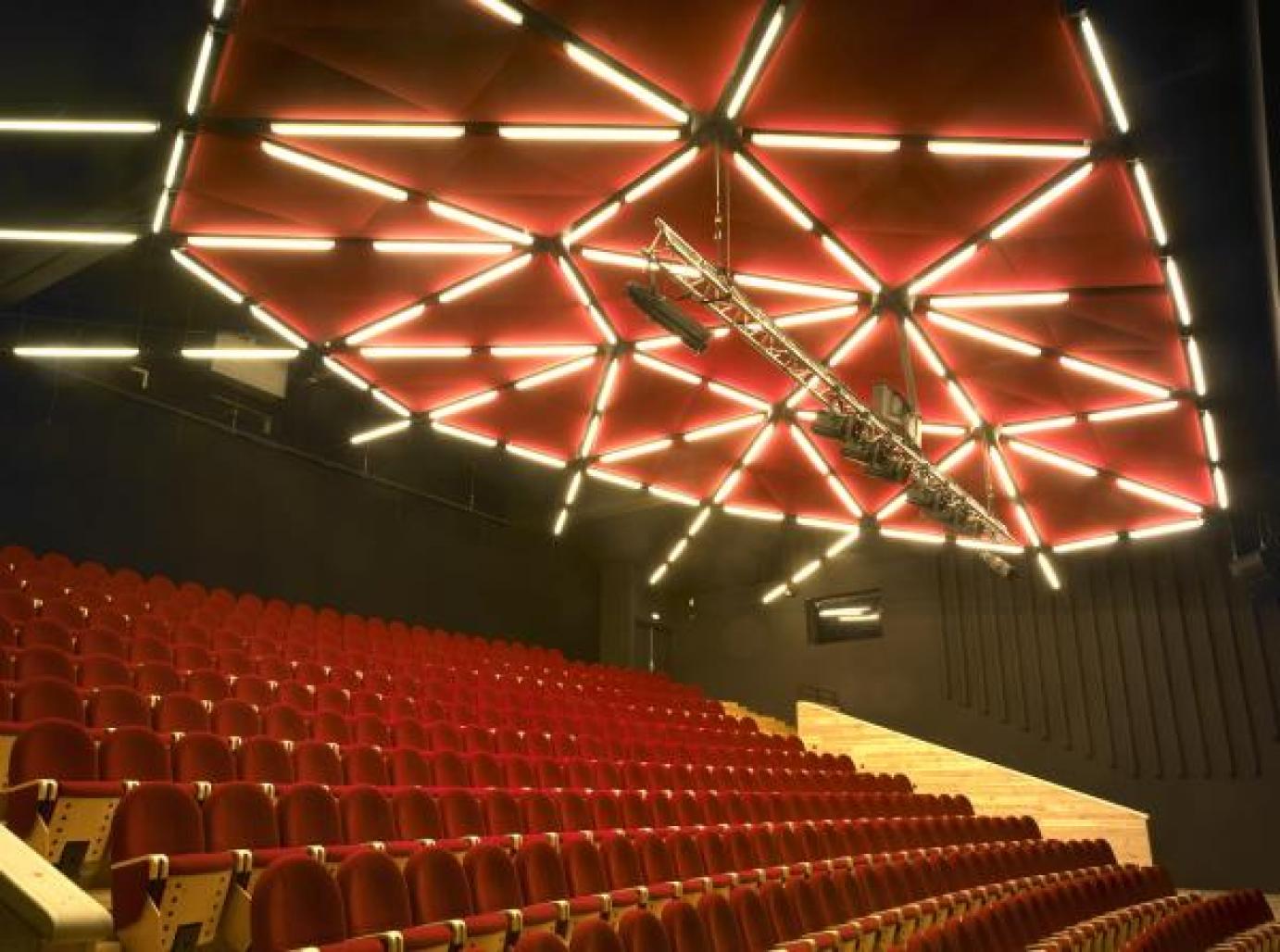The performance hall, with its black painted concrete walls and ceilings, is topped with a large red snowflake-shaped chandelier, which provides both light for the audience and acoustic correction.