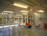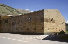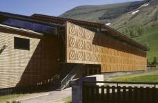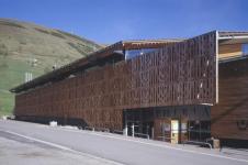 Wood is used here as a cultural referent for the mountains. The timber motif came into traditional regional architecture with the invention of the band saw. It is on the rise again because of the development of automatic cutting systems and computer-controlled cutting. Reflecting the return to popularity of this technique, the whole height of the sports hall is covered with a timber lacework based on a motif copied from the guard rails of an old chalet. The pattern, enlarged and multiplied to form a regular grid, changes its status and becomes a repetitive, abstract composition.