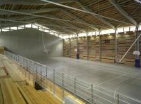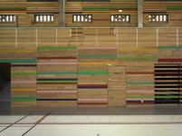 Inside the sports hall and the communal spaces, the walls and ceilings are faced with boards, some of them in natural wood and others painted in several colours, in order to generate a sort of "dyeing” effect. The gable walls of the gymnasium are made of natural sand concrete, set with multiple climbing holds in the same range of colours as used for the boards.