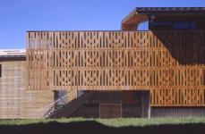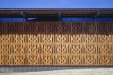 The wall of the performance hall is faced with narrow, unjointed wooden strips, with their edges cut at an angle to prevent water accumulating. The name of the facility is burnt directly onto this cladding – another old technique very much in fashion today, recruited into the language of modernity.