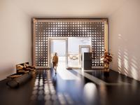 The innovative design of a grid with transparent circles, inspired by the intricate Fakhrumedin patterns found in Iranian architecture, has been implemented between the glass walls. The purpose of this grid is to regulate and manipulate the flow of light and view within the interior space. Each transparent circle has its unique and varying dimensions, placed inside a square with sides measuring 25 cm. The meticulously crafted grid not only serves its primary function of light control but also acts as a safeguard against potential theft. To achieve maximum efficiency, the grid has been constructed using metal, which provides a sturdy and secure barrier. However, the metallic base parts are heavy and rough, thus the middle sides of the parts have been removed, and a metal net has been placed instead of the cylinder to resolve this issue. The metal mesh functions as a curtain throughout the day and, in the dark, allows light to radiate outward, illuminating the space with a soft and gentle glow.