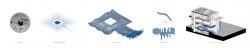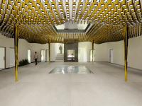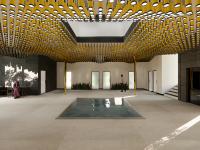 Cylinders with different lengths and different distances were considered randomly at the height and above the entrance part as a cover, which continuously moved towards the inside of the building. As they get closer to the interior space, their number increases and they become more organized until they enter the interior of the building and the ceiling of the lobby space. These cylinders are parametrically designed and placed on the entire ceiling of the lobby and establish a good connection with the outside and inside by creating a continuous golden surface. In the middle of the lobby space and above the square-shaped pool, with the proportions of the building itself, a void has been considered that establishes a visual connection between the upstairs space and the entrance space on the ground floor. Also, the reflection of the image of the cylinders on the surface of the water creates a very attractive atmosphere in the lobby. The cylinders with parametric design in the interior space become lights and provide all the artificial light in the lobby space, and these cylinders in the entrance and open space are designed as hollow and taller than the cylinders in the interior space.