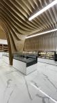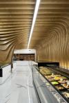 Pair one is the curved and orthogonal: The inner curvilinear “skin” which is applied on the wall-floor surface is composed with the austere and orthogonal geometry of the displays and the furniture design.