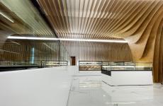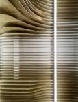 The fabrication of the inner skin involved methods that are both contemporary and traditional. The skin was designed as a continuous surface that occupies the ceiling and the back wall. This surface has its maximum deformation at the location of the column that exists in the centre of the floor plan. At that location the inner skin bends so it reaches the floor. The result is a continuous surface characterized by gradual deformation. A series of 59 section profiles was created with a gap of 18 cm. Each profile composes a custom panel that was fabricated with birch plywood sheets of 21 mm thickness. The pieces were cnc cut and assembled on site using traditional methods of wood connection. Each panel was suspended with L shape steel brackets at their specific location.