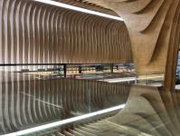 The protagonist inner surface of wall/ceiling is designed as a gradually - deforming continuous surface which is constructed as a sequence of composite plywood panels. The shape of each sheets derives from the sectioning of the continuous surface that has its maximum deformation in the central column and covers the ceiling and the opposing wall. The surface consists of 59 section profiles with a total of 312 pieces of plywood. Each section profile is composed by a number of plywood pieces that are connected using the traditional method of stud shear connectors and wood glue. Each profile is suspended by L shaped steel brackets.