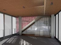 This small addition in the Pacific Palisades began with the owners’ wish for a place from which they could view the entirety of the property, a lot situated between two frontages by hillside gymnastics. Connecting to the existing patio and located above a detached garage, the deck will become the home’s main gathering space. Because of the extreme nature of the site, the top of the deck is located 24’ above the garage floor, affording an in-between space to be used as an extra room, be it yoga studio, study, or residential lounge. As the project was conceived of as a deck above a garage, the space between has been articluated as a transparent room hovering between trees to the north, vined trellis to the east, and terraced yard to the south. To mitigate such conditions as western sun, traffic noise and neighbors’ wandering eyes, the front {or west} facade of the project utilizes a layering system to buffer the interior. From the inside out, one first encounters a small platform which the owner will use as an interior orchid planting area. Set beyond the plants two triangles of of colored, frit and laminated glass sandwich an interior powder room and an exterior steel stair. The final layer, an articluated screen fabricated of 1/8” stainless steel rods, is employed not simply to block outsiders from looking in or to protect from the western exposure, but perhaps most importantly, to highlight the play of color, light and shadow of the setting sun. Here, the wires are arranged into vertically filigreed ‘planks’ which lie flush to the facade at the lowest point then rise and twist, thereby increasing transparency above the heads of the inhabitants, ending at a 90 degree alignment at guardrail height on the deck above. To access the terraced yard, a visitor would walk from the existing patio across a stepped glass bridge and around the sweeping arc of the sitting area, then down the stair between twisting screen and colored glass, and finally across a walkway of metal grating that hovers above a canna lilly planter below.