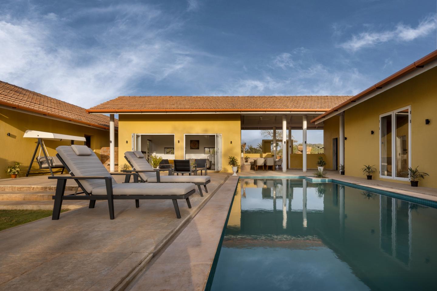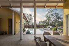 The design uses simple geometry and expansive open spaces to reimagine a pavilion-style home that responds to the climate and site conditions. The house is envisioned as an inward-looking sanctuary for a family that loves spending time with each other as much as hosting their loved ones. The design strikes a balance between the natural and built spaces. With warm, muted walls and reddish-brown Mangalore tiles, the Sienna House blends effortlessly into its backdrop.