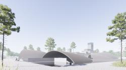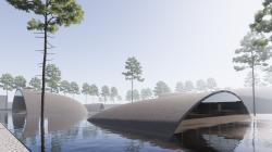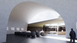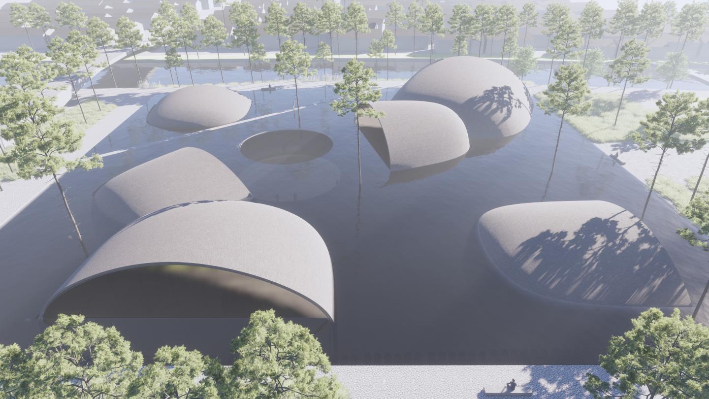 The design team draws inspiration from traditional wine jars stacked in the plant, which presents the aesthetics of repetition. With jars as the starting point, the design adopts half of its shell structure as the basic element and spatial module for the architecture and combines them in different angles to form a proportional layout and an organic form. The semi-buried design underwater satisfies the basic needs for ventilation, temperature and humidity to store wine. It also decreases the scale of architecture, which forms a harmonious relationship with the old street and the surrounding environment. In terms of cultural context, the design team hopes that the museum can remind visitors of the working scenes that people cleaned up the jars in the river in the old days, and arouse the "sleeping" town and a rustic sense of homesickness.
