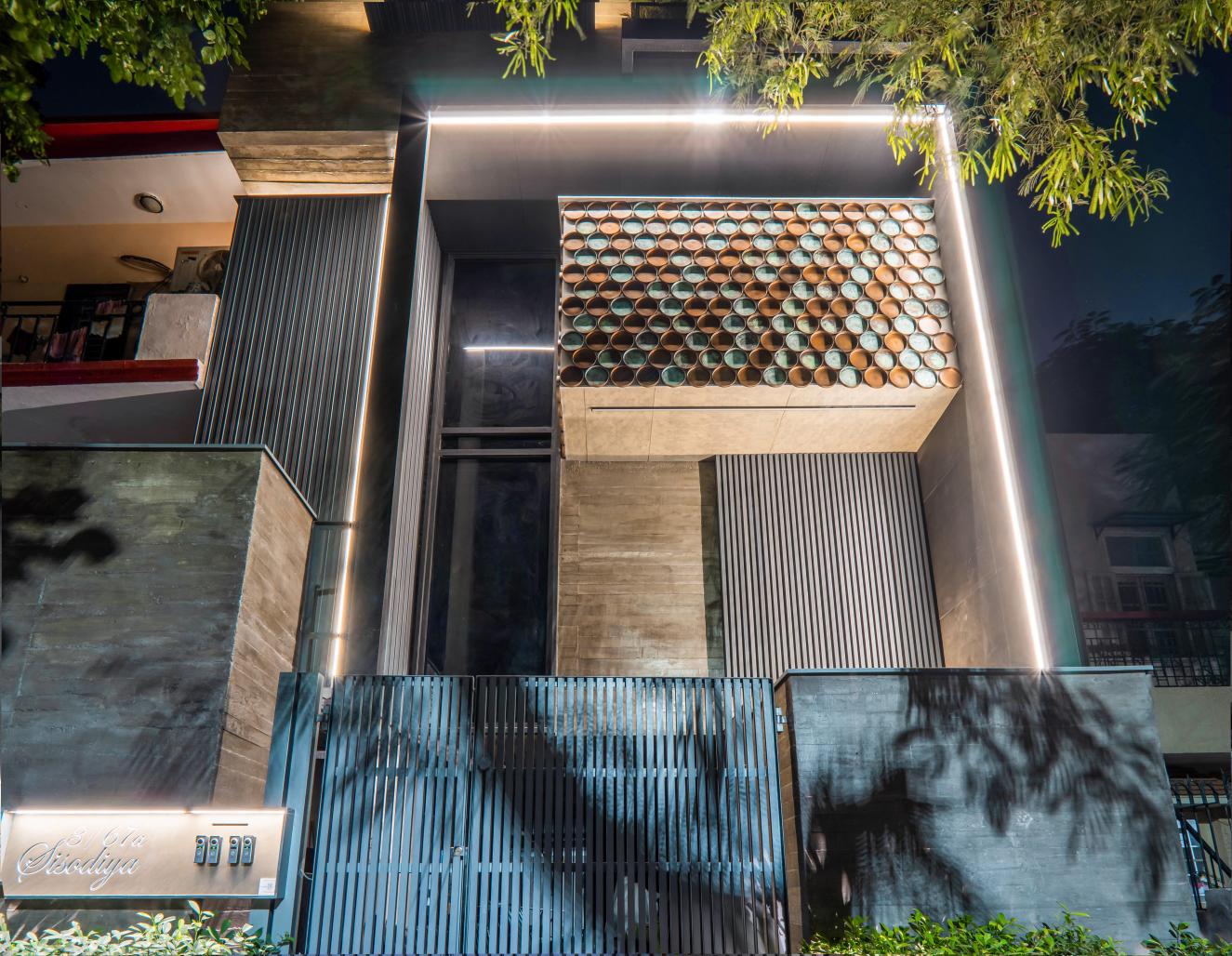 Snuggled in the busy residential area of Gurugram—is the home of Ar. Robin Sisodiya, the Founder of ASRO Arcade India. The architect’s home is built on a limited land area of 125 sq.m, with utmost aesthetics and efficiency. The primary idea for this “retreat” was a space that allows its residents to get closer to nature, which is successfully accomplished through the use of natural elements and materials in design. Further, the innovative one-of-a-kind facade design with colourful copper elements and aluminium makes the home stand out from the surroundings.