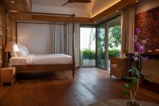 An arched poured-in-place gently curved concrete bridge used bamboo formwork and the impression of tropical leaves on the roadway to create the impression of a carpet. The villa is built on a concrete platform raised above the ground and supported on pilotis. The five pavilions are supported by forty two columns in locally sourced teak while the roof structures are in laminated wood with some steel reinforcing. The exterior walls are in teak planking with large expanses of glass doors. Natural ventilation is the norm and individual split air conditioning systems are discreetly placed in the ceilings of the access corridors of each lovable space.