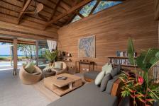 The built palette consists of natural teak columns and horizontal siding, grey local granite floors and cedar shingles which will grow silver with time. Traditionally inspired roof structures and deceptively open large sliding glass doors create enclosure and comfort, inviting the natural breeze to caress this intimate tropical sun-lit ocean paradise.