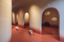 By purposely reducing the number of artificial objects, we have created a place full of warmth where both humans and micro pigs can feel at home together. The overall wall material was mortar with a bright red to pink gradation paint.