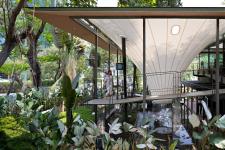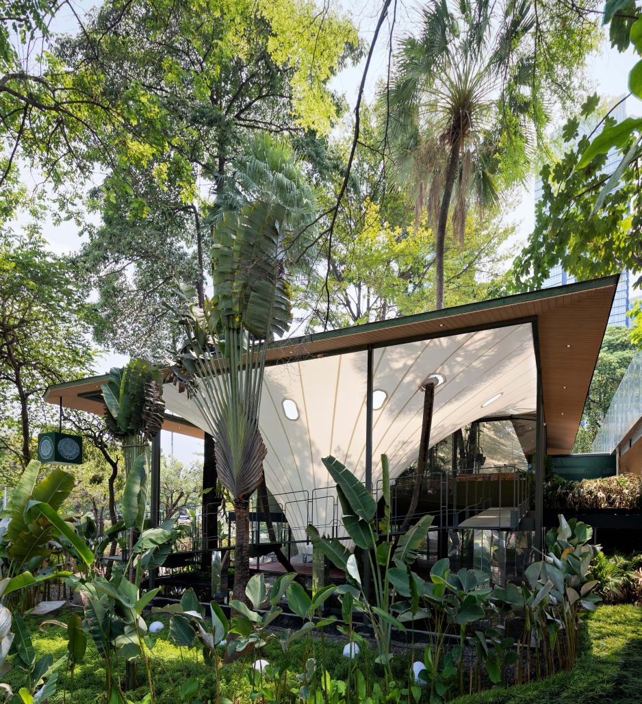 The entrance is hidden and scaled down in the ending of vertical plants, then the restaurant visitors would be greeted and wait in a narrow foyer surrounded by greenery before being accompanied to the upper bar-resto among the trees. This 750 sqm upper bar resto was framed by light steel-timber thatch roof around it that provides not only shades for all the glass opening, but also acted as the anchor for the parametric tensile in the middle.