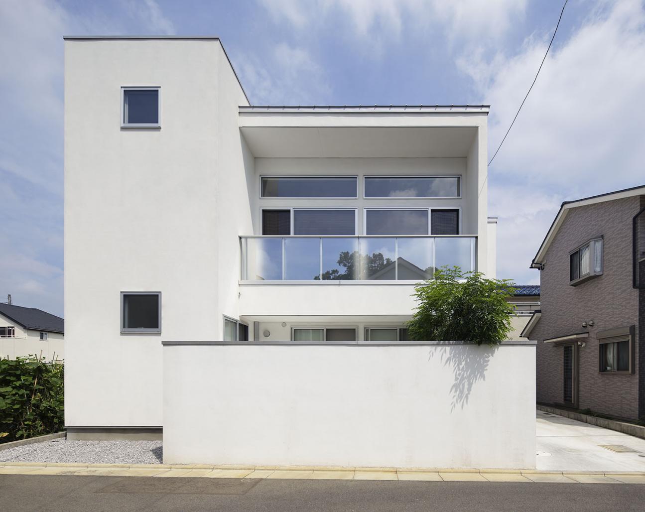The exterior features a compact, modern design with striking clean white exterior walls, creating a bright and fresh atmosphere. large glass windows on the second floor and a glass balcony railing give the building an open impression.