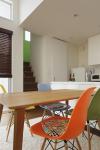 Pop accent colors are used in some of the interior furnishings. Furniture is also integrated with mid-century design pieces in similar color schemes, creating a bright and festive atmosphere.