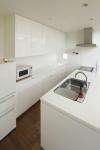 An open peninsula-style kitchen is adopted so that family members can communicate with each other without any separation in the living space. A small study space appears as you walk up the stairs next to the kitchen. I created an office space that is not too far from the family living space, but at the perfect distance to allow the family to feel each other's presence.
